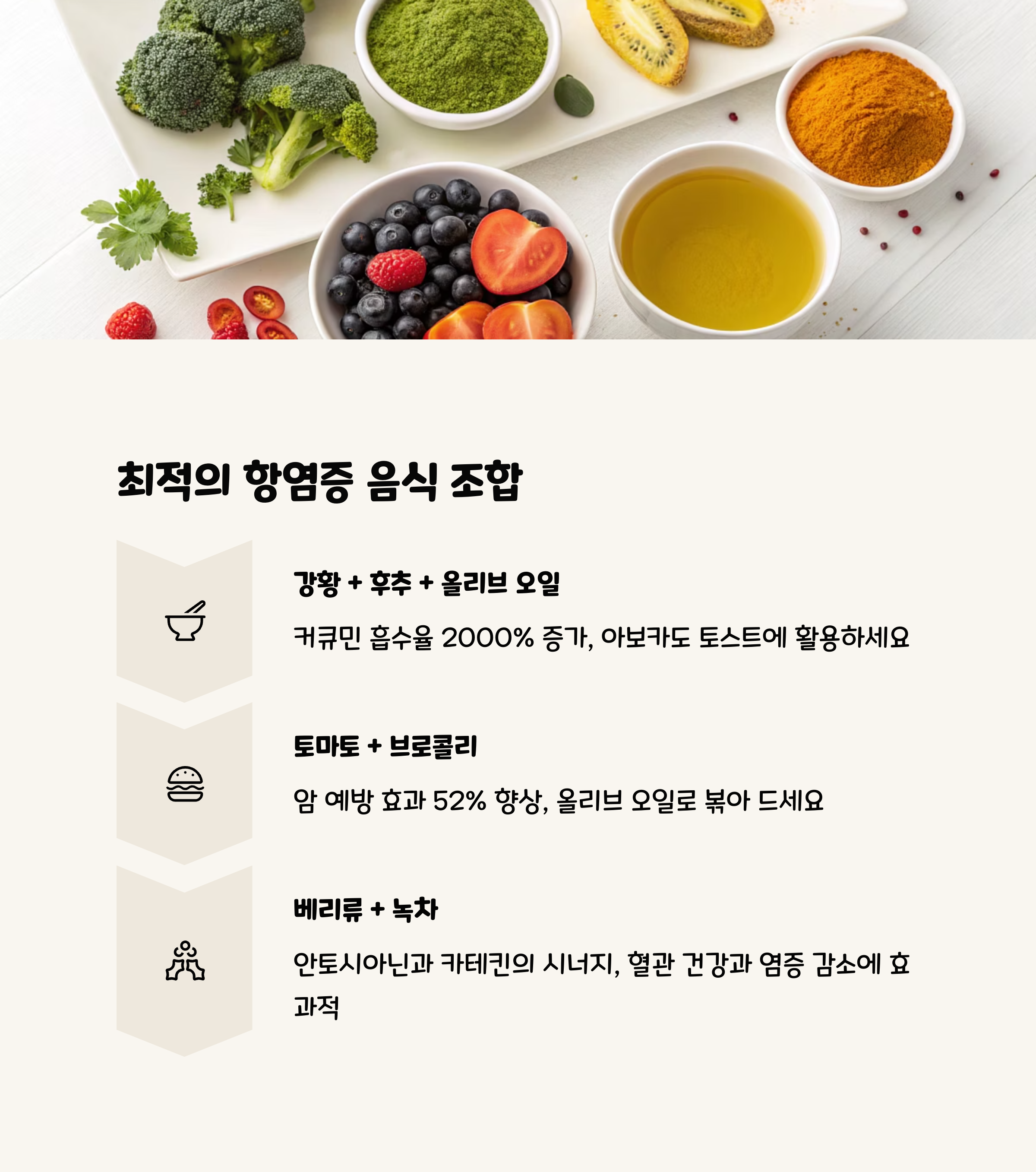 염증 낮추는 효과적인 음식 조합과 1주일 식단 플랜을 소개합니다. 강황+후추 조합으로 염증 억제 효과를 2000% 높이는 방법부터 토마토+브로콜리의 암 예방 효과까지! 쉽게 따라 할 수 있는 항염증 식습관으로 건강을 지키세요. 2025년 최신 영양학 연구 기반.