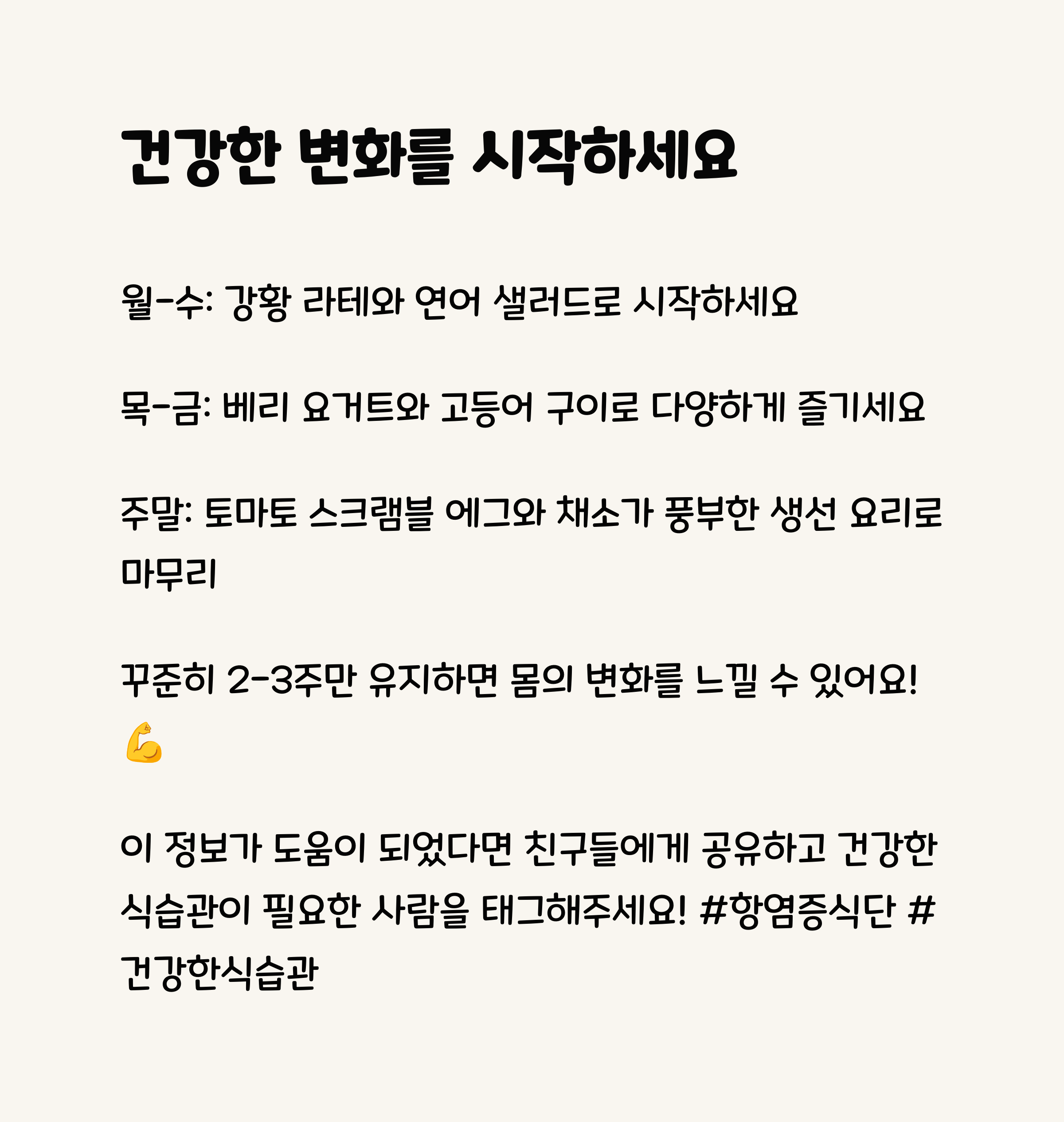 월요일부터 수요일: 아침은 강황 라테와 아몬드 토스트로 시작하세요. 점심에는 연어 샐러드나 마른오징어 비빔밥이 좋습니다. 저녁은 토마토 파스타나 브로콜리 닭가슴살 구이가 적당합니다. 간식으로는 블루베리나 다크 초콜릿(카카오 함량 70% 이상)을 드세요.
