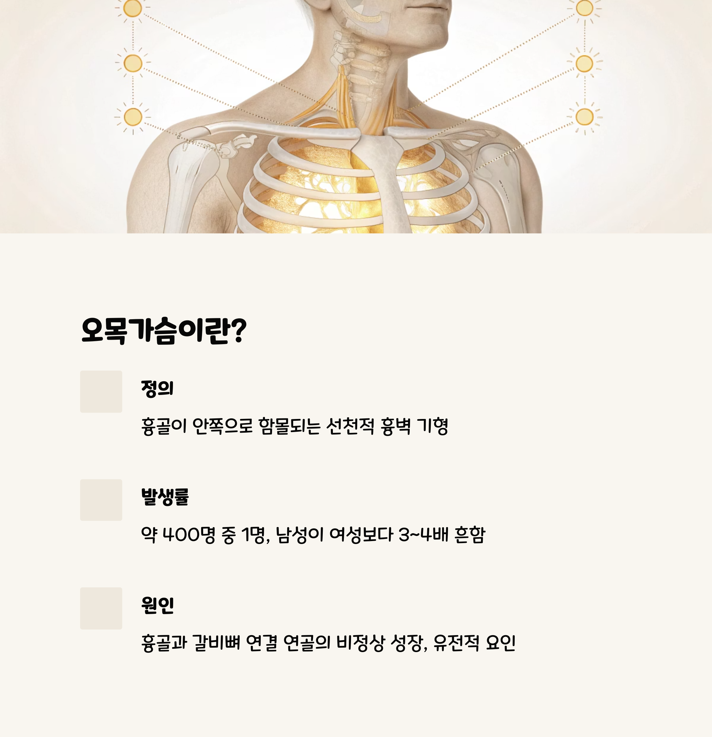 오목가슴은 의학적으로 '흉부함몰' 또는 '누두흉'이라고도 불리는 선천적인 흉벽 기형입니다. 가슴뼈(흉골)가 안쪽으로 함몰되어 가슴 중앙부에 우묵한 모양이 생기는 상태를 말합니다. 대략 400명 중 1명 정도의 비율로 발생하며, 남성이 여성보다 약 3~4배 더 흔하게 나타납니다. 오목가슴은 단순한 외관상의 문제로만 여겨질 수 있지만, 심한 경우 심장과 폐 기능에 영향을 미칠 수 있어 주의가 필요합니다.