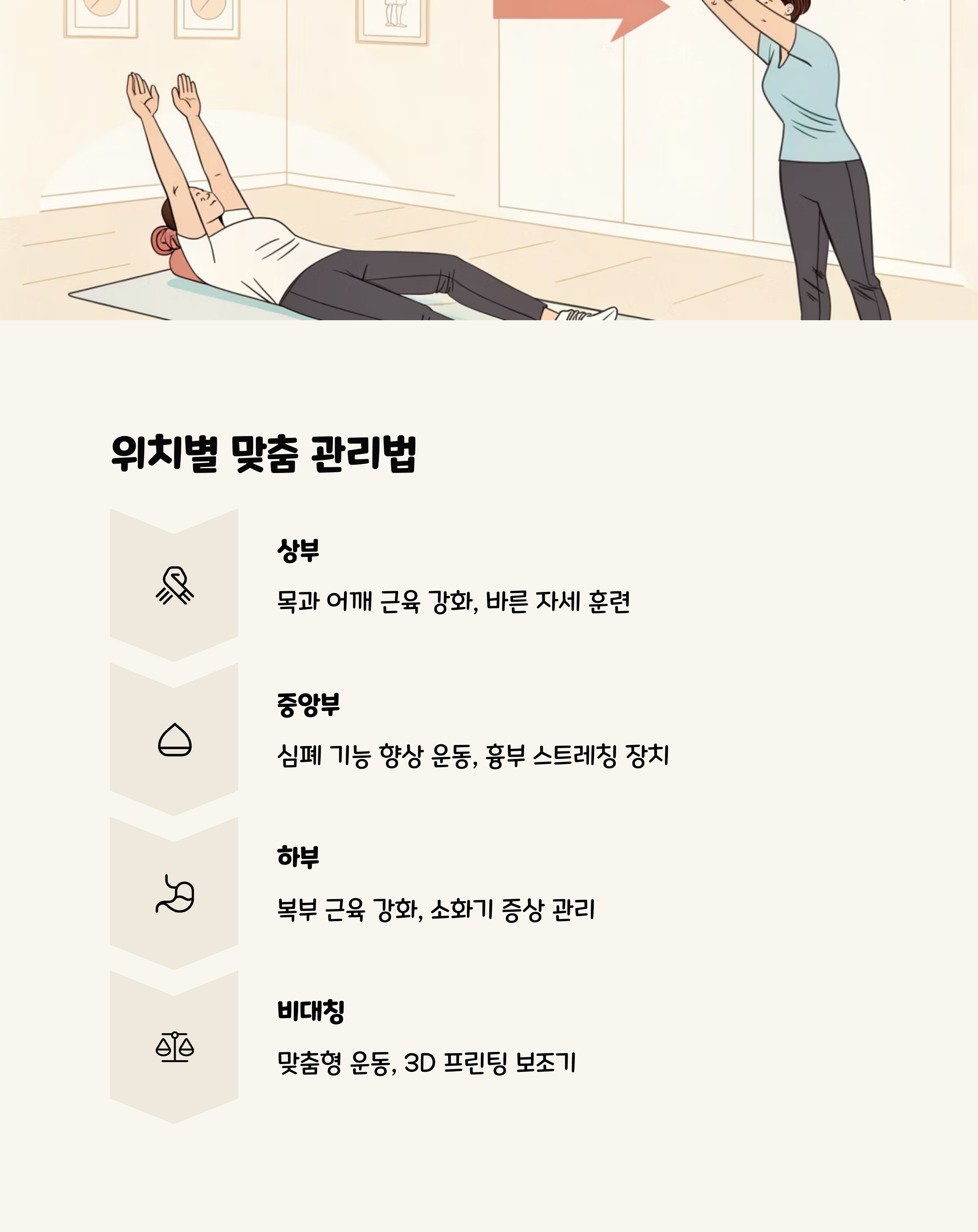 비대칭 오목가슴 환자에게는 개인 맞춤형 운동 프로그램이 필수적입니다. 좌우 근육 불균형을 교정하고, 척추 정렬을 개선하는 운동이 중심이 되어야 합니다. 물리치료사나 운동 전문가의 정기적인 평가와 프로그램 조정이 필요하며, 필요에 따라 보조기의 사용도 고려할 수 있습니다. 최근에는 3D 프린팅 기술을 활용한 맞춤형 보조기가 개발되어 비대칭 교정에 좋은 결과를 보이고 있습니다.