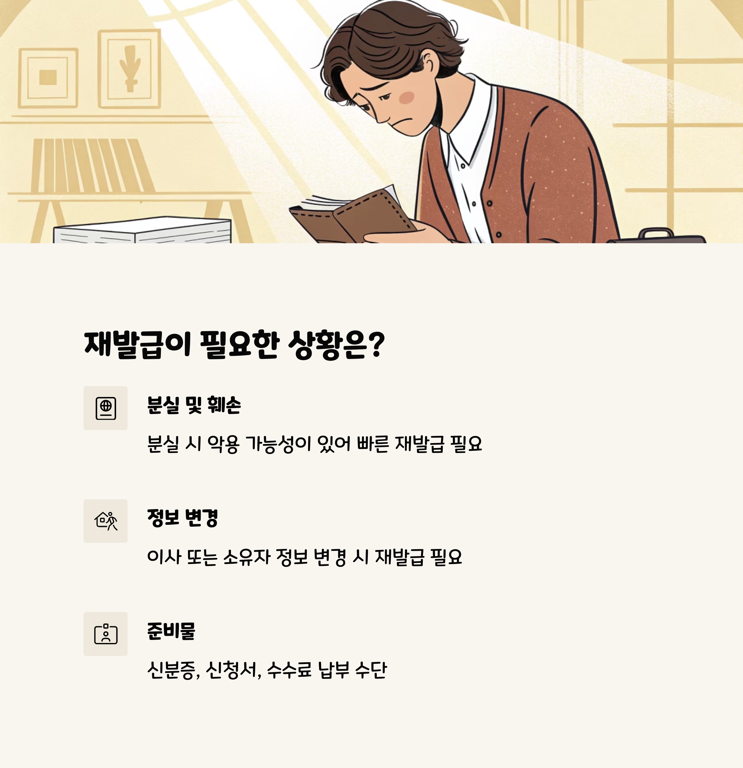 반면 방문 재발급은 즉시 발급이 가능하다는 큰 장점이 있습니다. 또한 담당자에게 직접 문의하며 진행할 수 있어 불확실한 사항을 바로 확인할 수 있습니다. 다만 업무 시간 내에만 방문해야 하고, 대기 시간이 발생할 수 있다는 단점이 있습니다.