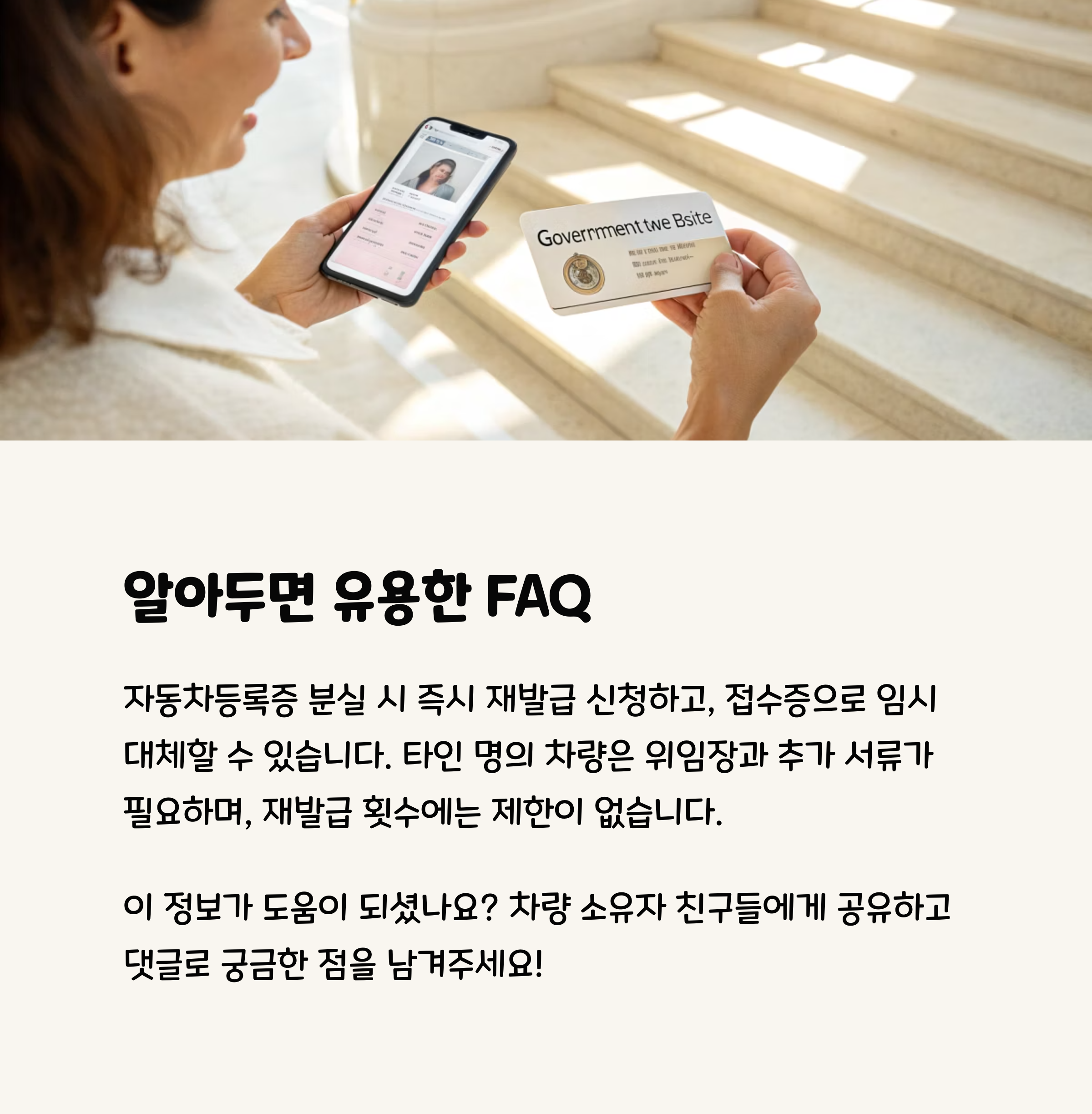 Q: 타인 명의 차량의 등록증도 재발급받을 수 있나요? A: 차량 소유자가 아닌 경우, 소유자의 위임장과 신분증 사본, 대리인 신분증이 추가로 필요합니다. 가족관계증명서 등 관계를 증명할 수 있는 서류도 준비하시는 것이 좋습니다.