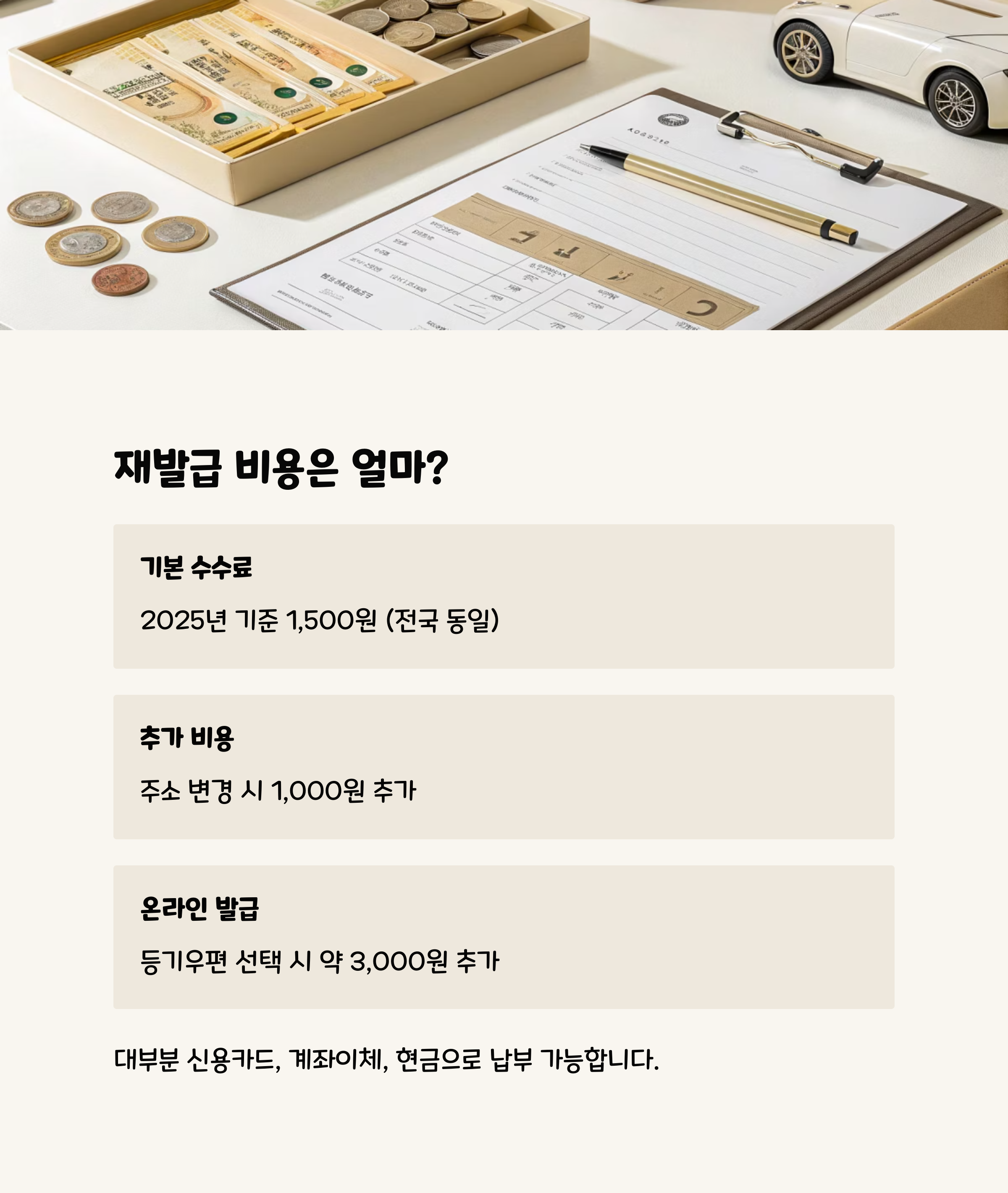 2025년 기준 자동차등록증 재발급 비용은 1,500원! 분실·훼손 시 온라인 또는 방문 신청 방법과 준비물 완벽 정리. 수수료 절약 팁과 빠른 발급 방법까지 한눈에 확인하세요. 당일 발급 가능한 한 자동차등록증 재발급 가이드!