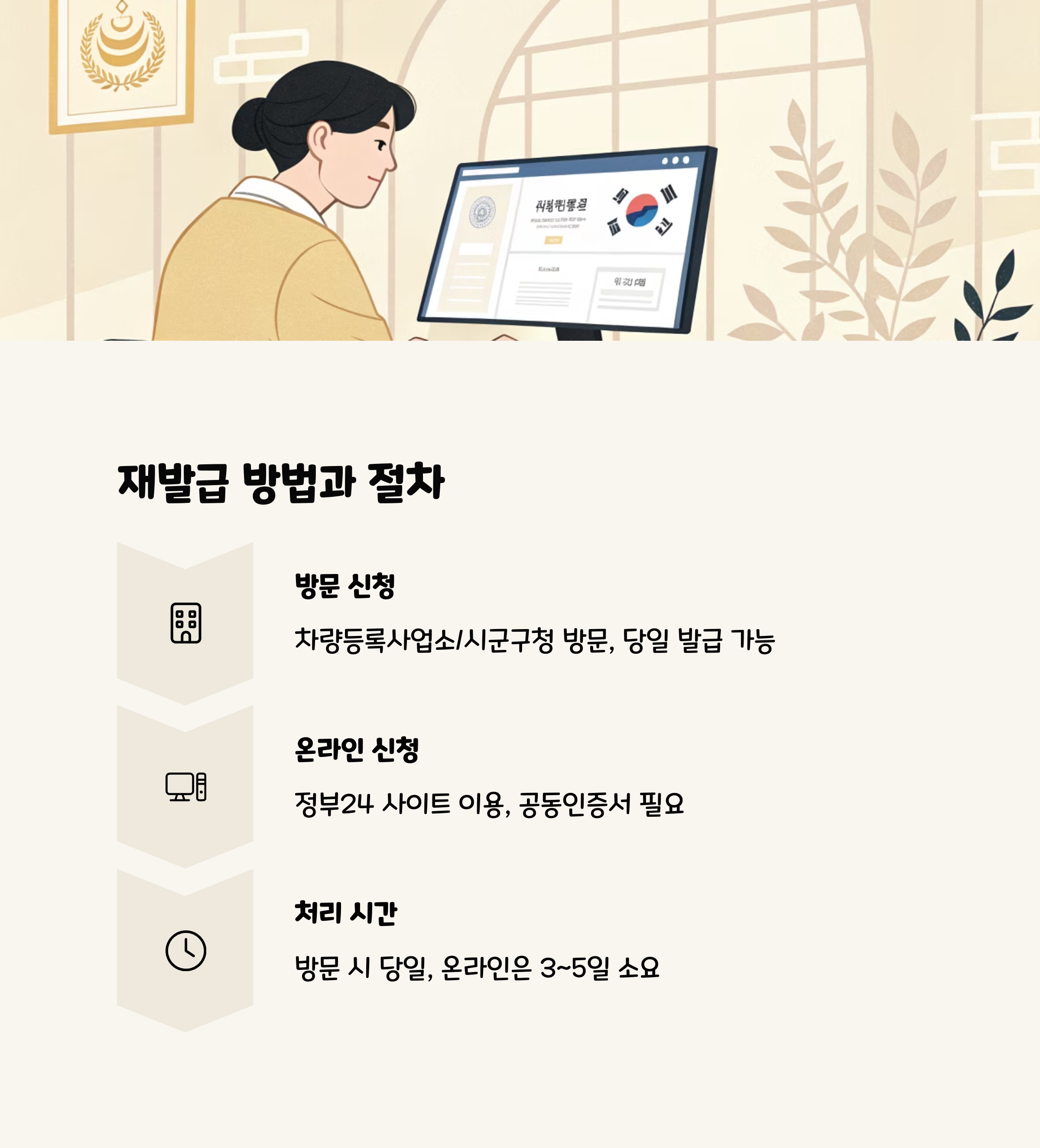 Q: 자동차등록증 재발급은 얼마나 빨리 받을 수 있나요? A: 방문 신청 시 대부분 당일 발급이 가능합니다. 온라인 신청의 경우 처리 후 등기우편 발송까지 약 3~5일 정도 소요됩니다. 급한 경우 방문 신청 후 직접 수령하는 것이 가장 빠릅니다.