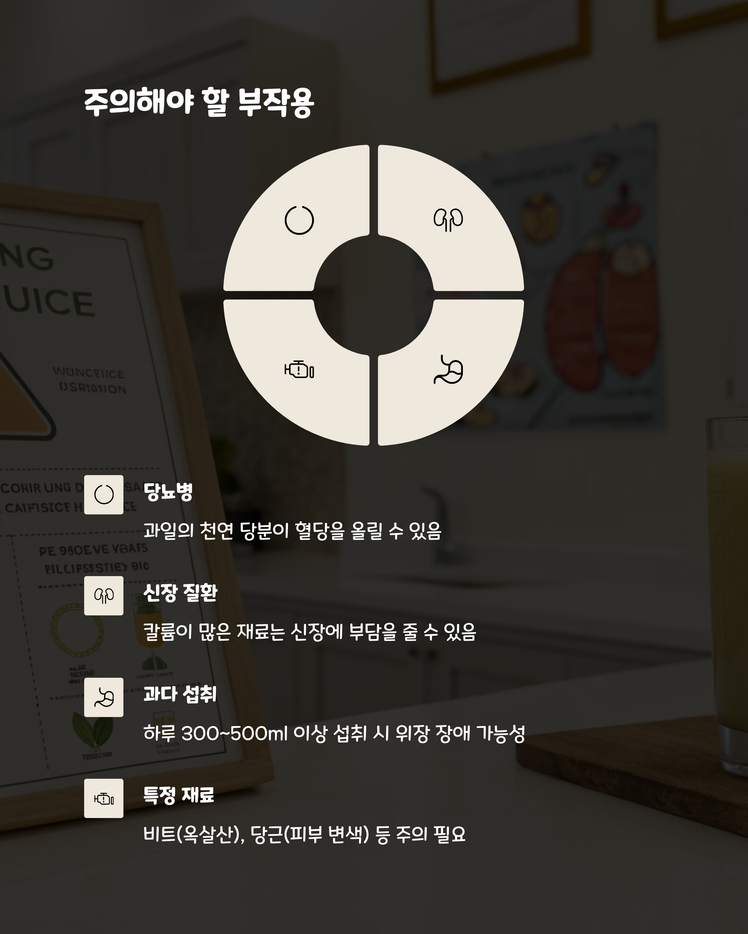 모든 건강식품이 그렇듯 해독주스도 주의해야 할 점이 있습니다. "당뇨병이나 신장 질환이 있으신 분들"은 특히 조심해야 합니다. 과일에 들어있는 천연 당분은 혈당을 올릴 수 있고, 칼륨이 많은 재료들은 신장에 부담을 줄 수 있기 때문입니다.