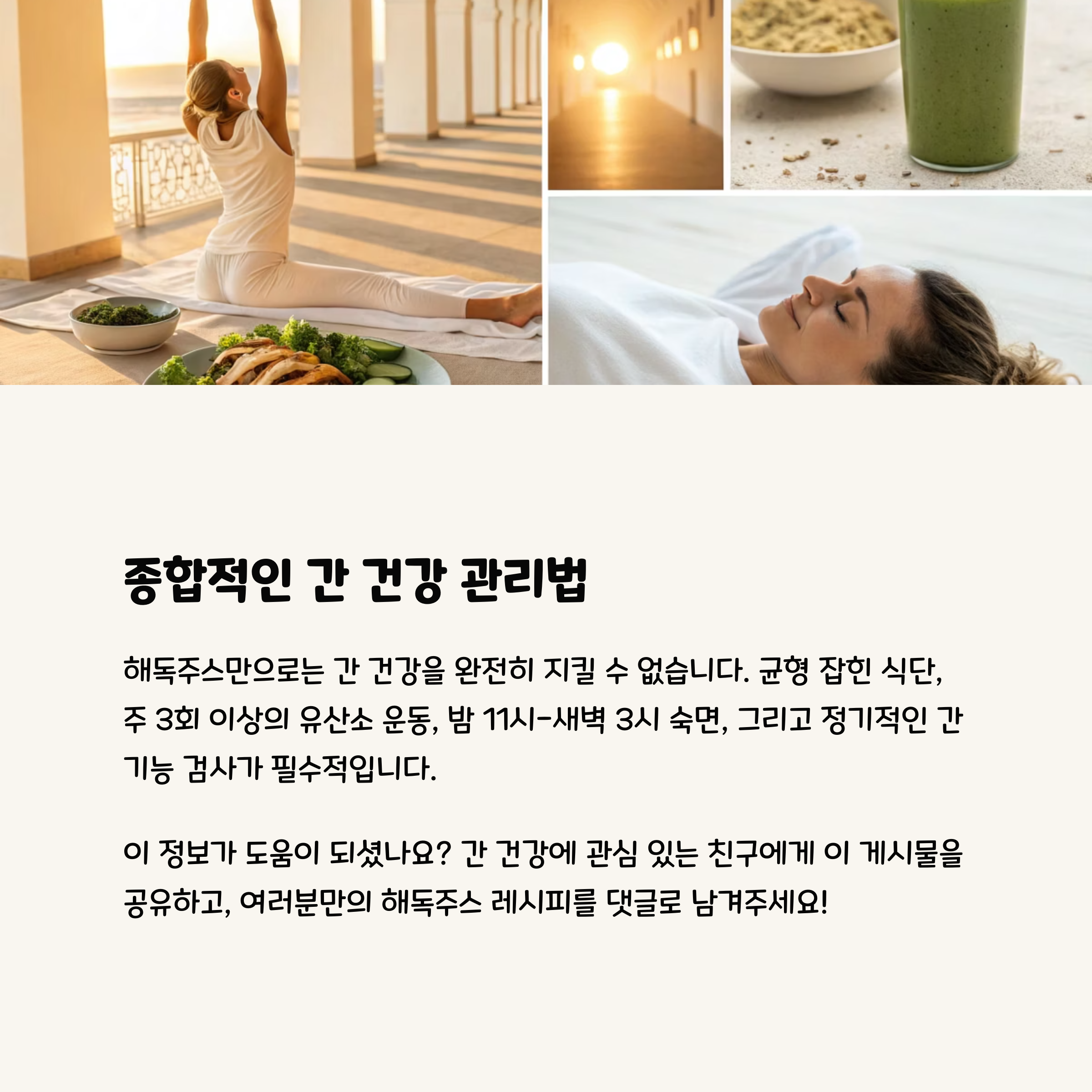 해독주스 하나만으로는 간 건강을 완전히 지킬 수 없습니다. "종합적인 생활습관 개선"이 필수적입니다. 첫째, 균형 잡힌 식단을 유지하되 기름진 음식이나 가공식품은 줄이고, 단백질과 채소를 충분히 섭취하세요. 둘째, 주 3회 이상의 꾸준한 유산소 운동은 간에 쌓인 지방을 연소시키는 데 큰 도움이 됩니다.